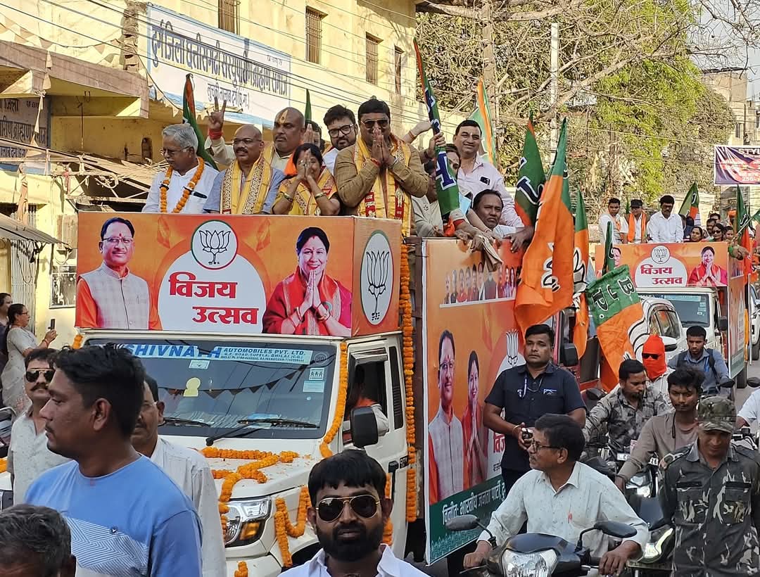 आयोजित विजय जुलुस रैली जिला भाजपा कार्यालय से प्रारंभ होकर इंदिरा मार्केट, फरिश्ता कंपलेक्स, पोलसाय पारा, तकिया पारा, होटल मान चौक ,कंकाली मंदिर चौक, चंडी मंदिर चौक, शिवपारा, गवली पारा, गांधी चौक, जवाहर चौक से होते हुए भाजपा कार्यालय में जाकर संपन्न हुई