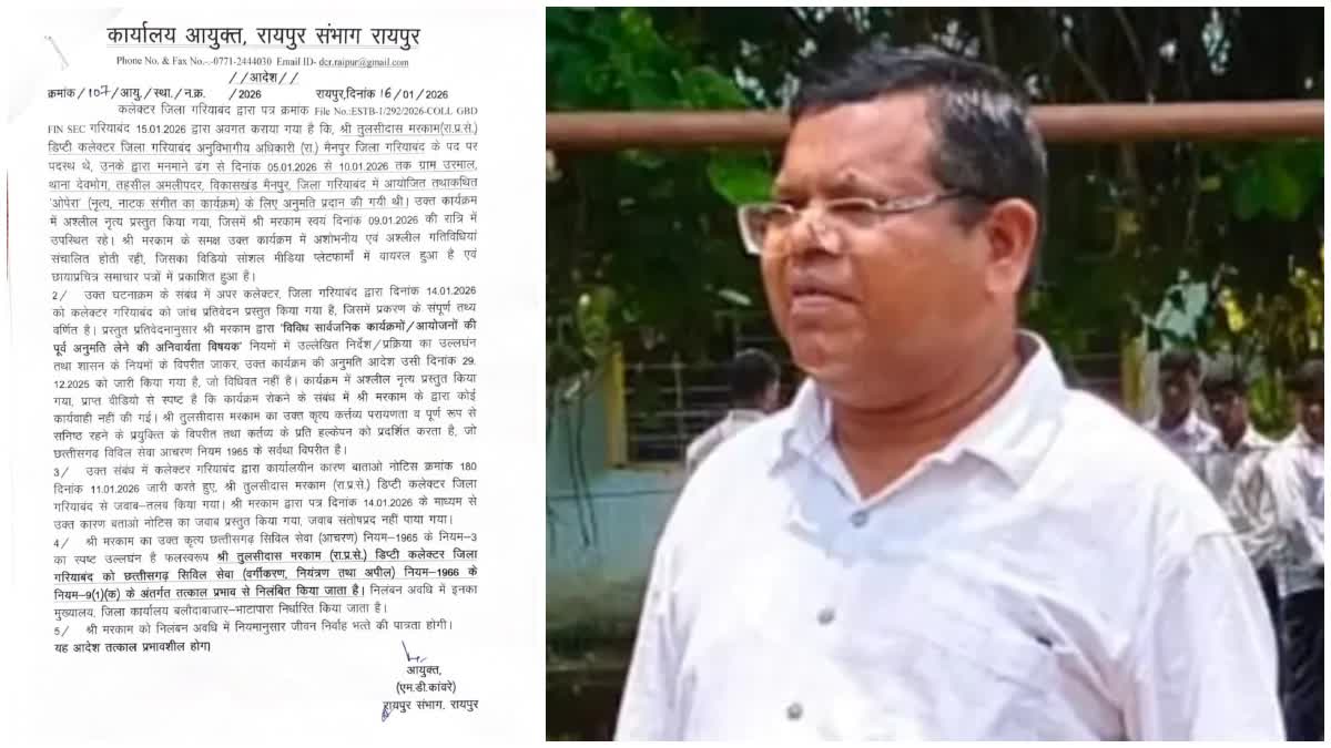 डिजिटल डेस्क|रायपुर/गरियाबंद। गरियाबंद जिले के उरमाल क्षेत्र में आयोजित अश्लील नृत्य कार्यक्रम के मामले में प्रशासन ने एक और बड़ी कार्रवाई की है। मैनपुर के एसडीएम तुलसीदास मरकाम को रायपुर संभागीय आयुक्त द्वारा तत्काल प्रभाव से निलंबित कर दिया गया है। इससे पहले वीडियो वायरल होने के बाद गरियाबंद कलेक्टर ने उन्हें कारण बताओ नोटिस जारी कर एसडीएम मैनपुर के पद से हटा दिया था
