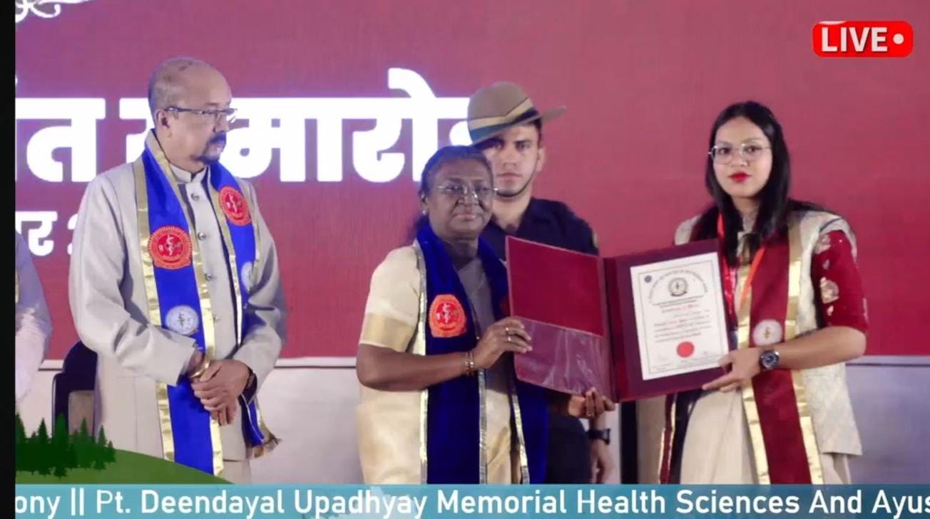 दुर्ग। “राष्ट्रपति द्रौपदी मुर्मू ने छत्तीसगढ़ के पंडित दीनदयाल उपाध्याय स्मृति स्वास्थ्य विज्ञान एवं आयुष विश्वविद्यालय के दीक्षांत समारोह में अपोलो कॉलेज ऑफ फिजियोथेरेपी की छात्रा कुमारी निश्चिता अयला सोना को गोल्ड मेडल से सम्मानित किया”