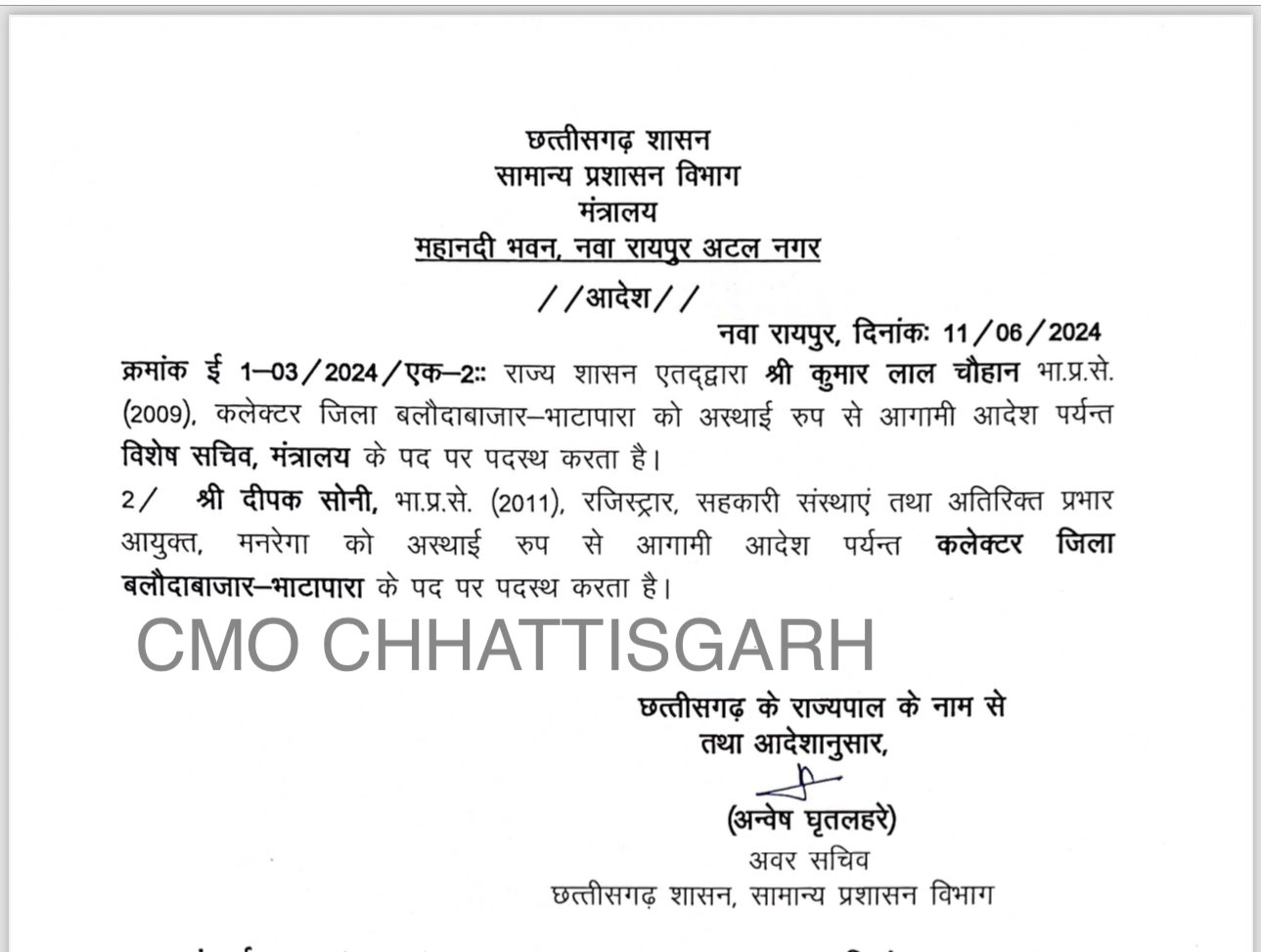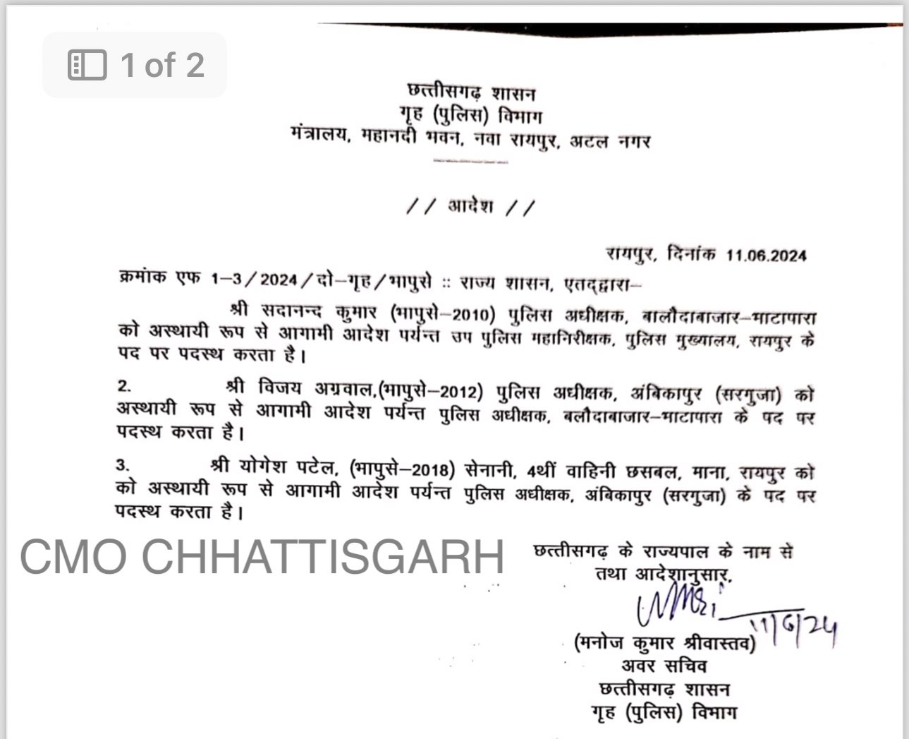 Trending News Uncategorized छत्तीसगढ़ लेटेस्ट अपडेट CG BREAKING: देर रात छत्तीसगढ़ सरकार ने की बड़ी कार्रवाई, बलौदाबाजार के एसपी-कलेक्टर दोनों की छुट्टी June 12, 2024 Shivnath Samvad 0 Comments रायपुर 12 जून 2024। देर रात सरकार ने बड़ी कार्रवाई करते हुए बलौदाबाजार के एसपी-कलेक्टर दोनों की छुट्टी कर दी। बलौदाबाजार के साथ-साथ सरगुजा के भी पुलिस कप्तान बदले गये हैं।