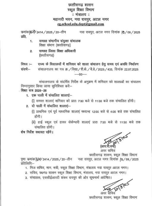 छत्तीसगढ़ स्कूल शिक्षा विभाग ने राज्य के सभी विद्यालयों के समय सारिणी में महत्वपूर्ण बदलाव की घोषणा की है। अब राज्य के सभी स्कूलों में शनिवार को विशेष समय सारिणी लागू होगी।
