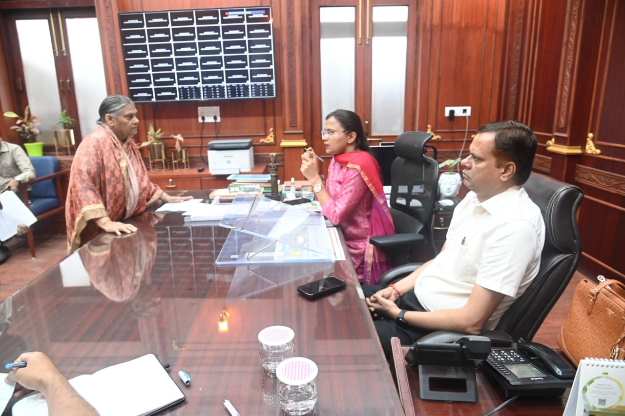 दुर्ग, 30 जुलाई 2024/ संभागायुक्त श्री सत्यनारायण राठौर की उपस्थिति में कलेक्टर सुश्री ऋचा प्रकाश चौधरी ने जनदर्शन में बड़ी संख्या में पहुंचे लोगों से मुलाकात कर उनकी समस्याएं सुनी। उन्होंने जनदर्शन में पहुंचे सभी लोगों की समस्याओं को गंभीरता से सुना और समुचित समाधान एवं निराकरण करने संबंधित विभागों को शीघ्र कार्यवाही कर आवश्यक पहल करने को कहा। जनदर्शन में आज 205 आवेदन प्राप्त हुए। जनदर्शन में आवेदन लेकर पहुंचे पदुम नगर चरोदा निवासी ने अपने 10 वर्षीय पोते को दिव्यांग छात्रावास में प्रवेश दिलाने कलेक्टर से गुहार लगाते हुए कहा कि उनका पोता दिव्यांग है। बच्चे के माता-पिता रोजगार के लिए जिले से बाहर निवास करते हैं। अपनी आर्थिक स्थिति को देखते हुए बच्चे को शिक्षा प्रदान करने के लिए दिव्यांग छात्रावास दुर्ग में प्रवेश दिलाने आवेदन किया। इस पर कलेक्टर ने आदिम जाति तथा अनुसूचित जाति विकास विभाग एवं समाज कल्याण विभाग को तत्काल कार्यवाही करने के निर्देश दिए।