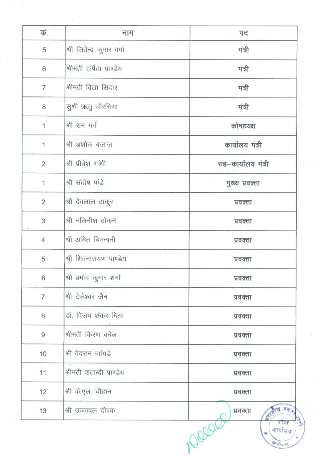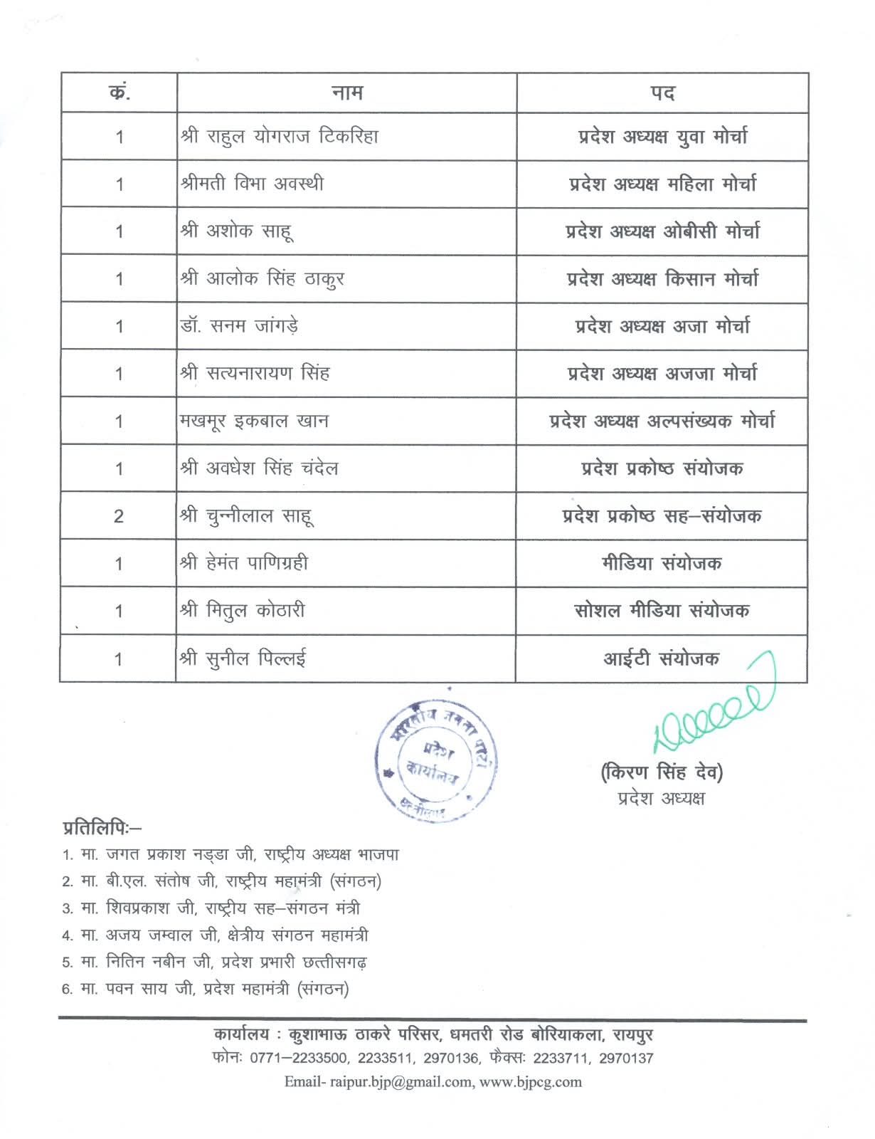 Trending News Uncategorized छत्तीसगढ़ लेटेस्ट अपडेट CG BREAKING:भाजपा छत्तीसगढ़ प्रदेश पदाधिकारियों की घोषणा……देखें लिस्ट August 13, 2025 Shivnath Samvad 0 Comments भाजपा राष्ट्रीय अध्यक्ष श्री जे.पी. नड्डा जी की सहमति से, भाजपा प्रदेश अध्यक्ष श्री किरण सिंह देव जी ने भारतीय जनता पार्टी, छत्तीसगढ़ के प्रदेश पदाधिकारियों की घोषणा की है।