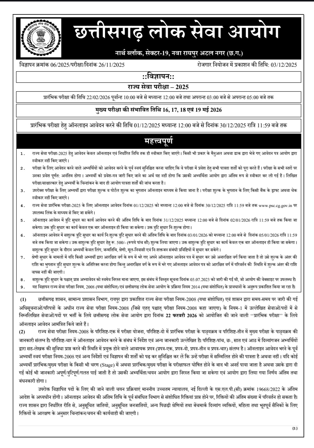 छत्तीसगढ़ लोक सेवा आयोग ने राज्य सेवा परीक्षा–2025 का विस्तृत विज्ञापन जारी कर दिया है। आयोग के विज्ञापन क्रमांक 06/2025/परीक्षा/दिनांक 26/11/2025 के अनुसार प्रारंभिक परीक्षा 22 फरवरी 2026 को दो सत्रों में आयोजित की जाएगी। मुख्य परीक्षा की संभावित तिथियाँ 16 से 19 मई 2026 निर्धारित की गई हैं।