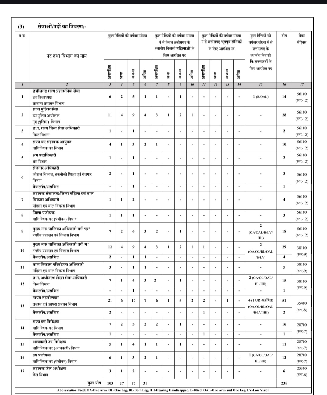 रिक्त पदों की कुल संख्या 238 है, जो संबंधित विभागों से प्राप्त संशोधित मांग पत्र के अनुसार परिवर्तनीय है। दिव्यांगजन, महिला, अनुसूचित जाति/जनजाति, ओबीसी एवं भूतपूर्व सैनिकों के लिए आरक्षण नियमों के अनुसार लागू होगा।