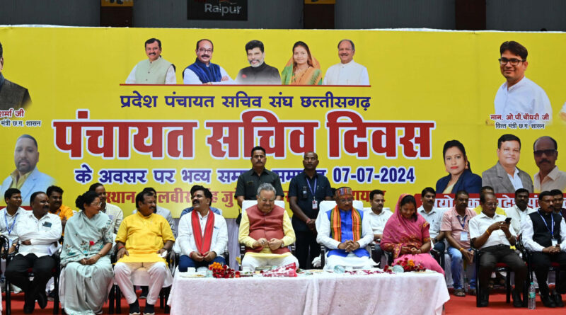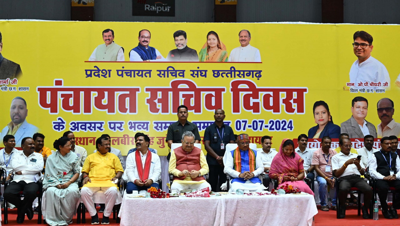 7 July 2024/मुख्यमंत्री श्री विष्णु देव साय ने आज राजधानी रायपुर के सरदार बलबीर सिंह जुनेजा इंडोर स्टेडियम में पंचायत सचिव दिवस के अवसर पर प्रदेश पंचायत सचिव संघ छत्तीसगढ़ द्वारा आयोजित सम्मान समारोह में शिरकत की। मुख्यमंत्री ने कहा कि सरकार पंचायत सचिवों के हितों का पूरा ध्यान रखती है। सरकार बनते ही पंचायत सचिवों की अपेक्षाओं को पूरा किया गया। इस अवसर पर मुख्यमंत्री ने घोषणा करते हुए कहा कि प्रदेश पंचायत सचिव संघ द्वारा शासकीयकरण की मांग को पूरा किया जाएगा और इसके क्रियान्वयन के लिए कमेटी का गठन किया जाएगा। मुख्यमंत्री की घोषणा पर संघ के पदाधिकारियों ने मुख्यमंत्री का आभार गजमाला से किया।