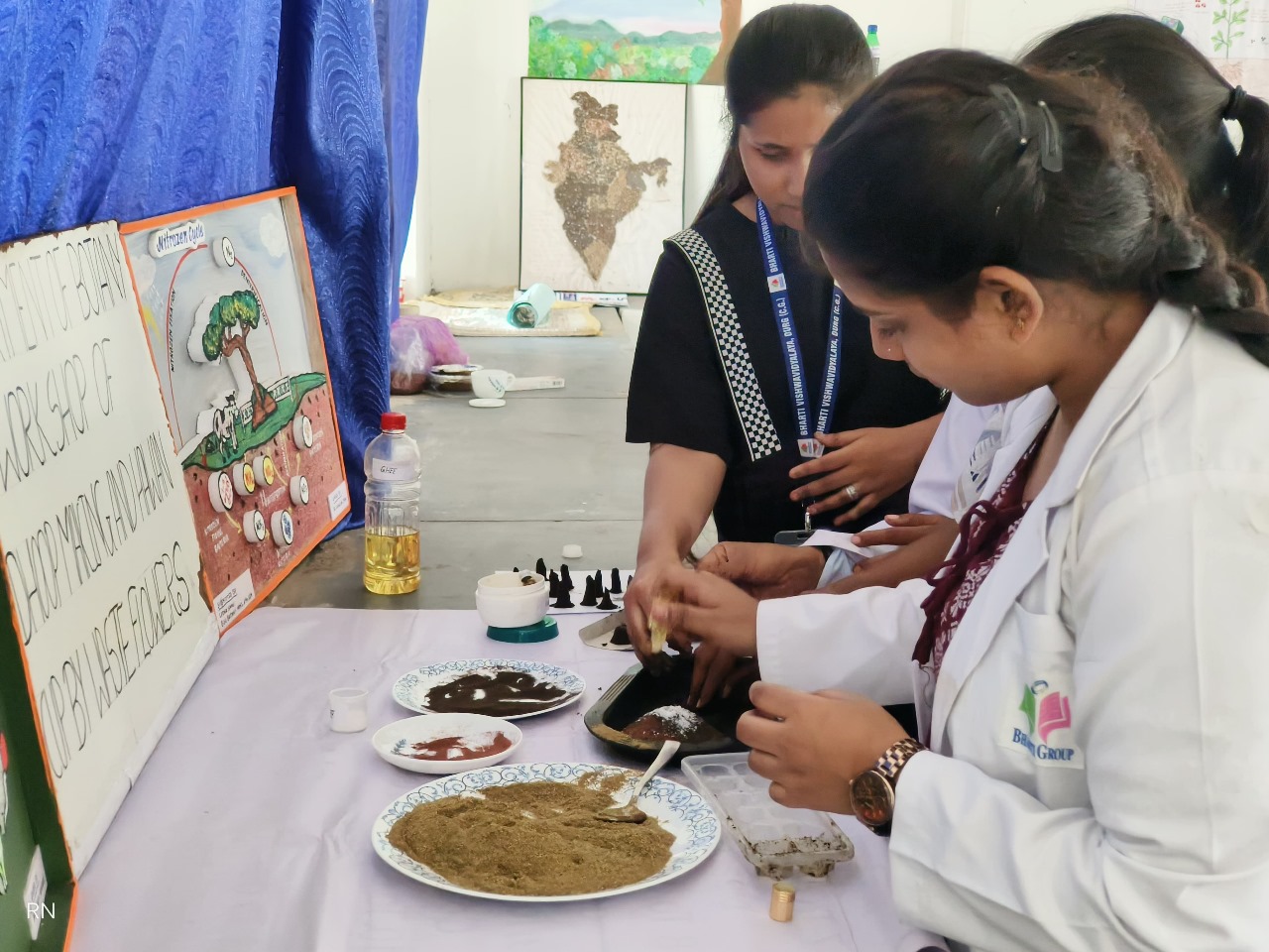 दुर्ग, भारती विश्वविद्यालय, दुर्ग द्वारा विद्यार्थियों हेतु पूजन सामग्री निर्माण कार्यशाला का आयोजन किया गया। कार्यशाला में मंदिर में चढ़े हुऐ फूलों के द्वारा धूप बत्ती, हवन कप और सीड बॉल बनाने का प्रशिक्षण दिया गया। प्रशिक्षण में विद्यार्थियों को मंदिर में चढ़े फूलों को सूखाकर, बारिक पीसकर उसमें कोयला, दशांग, तेजपत्ती, नारियल पील, लोभान, लौंग, कंडा और सुगंधित तेल, पीसे हुए फूलों के साथ मिलाकर उसमें गम ब्लाइंडर एवं घी मिलाकर धूप बत्ती का आकार देना सिखाया गया। इस प्रकार विद्यार्थियों ने सूखे अपशिष्ट फूलों से धूपबत्ती और हवन कप तैयार किया।