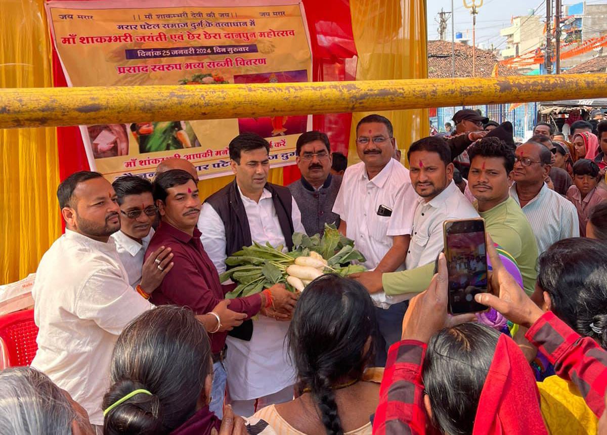दुर्ग/25 जनवरी/पटेल मरार समाज द्वारा अपनी आराध्य माता शाकंभरी की जयंती मनाई जा रही है।इस अवसर पर गुरुवार को भी विभिन्न आयोजन हुए।दुर्ग राज कोसरिया पटेल मरार समाज ने नगर पालिक निगम सीमा क्षेत्र अंतर्गत चंडी चौक मठपारा में शाकंभरी जयंती पर हरी सब्जियों का निशुल्क वितरण किया। कार्यक्रमों में समाज के लोगों को अपने पारंपरिक व्यवसाय को आगे बढ़ाने का संकल्प भी दिलाया गया। इस अवसर पर मुख्य अतिथि महापौर धीरज बाकलीवाल ने कहा कि मरार समाज मेहनतकश समाज है। समाज संगठित होने के साथ ही साथ शक्तिशाली भी है।इस अवसर गया जी पटेल,एमआईसी दीपक साहू,पूर्व पार्षद विजयंत पटेल,काशीराम रात्रे,बजरंग पटेल,रामेश्वर पटेल अमित पटेल राजेश पटेल गजानंद पटेल,भरत पटेल,पंच पटेल,गजानंद पटेल, तीरथ पटेल,भानु पटेल, सहित बड़ी संख्या में समाज के लोग उपस्थित रहे।महापौर धीरज बाकलीवाल एवं सभापति राजेश यादव की मौजूदगी में विधि-विधान से पूजा की गई।महापौर धीरज बाकलीवाल व सभापति राजेश यादव ने कहा कि जयंती मनाने से जहां सामाजिक संगठन मजबूत होता है।वहीं युवाओं और नई पीढ़ी को अपने समाज का इतिहास, परम्परा व संस्कृति से रूबरू होने का मौका मिलता है। छेरछेरा पुन्नी शाकंभरी जयंती के अवसर पर पटेल धर्मशाला गया नगर दुर्ग में पटेल समाज के द्वारा शाकंभरी पूजा का आयोजन किया गया पश्चात चंडी मंदिर चौक में साग सब्जी का निशुल्क वितरण किया गया इस अवसर पर महापौर धीरज बाकलीवाल सभापति राजेश यादव व गया पटेल अध्यक्ष पटेल समाज उपस्थित हुये