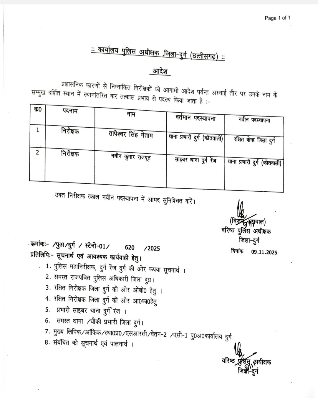 उनके स्थान पर साइबर थाना दुर्ग रेंज में पदस्थ निरीक्षक नवीन कुमार राजपूत को थाना प्रभारी दुर्ग (कोतवाली) की जिम्मेदारी सौंपी गई है।