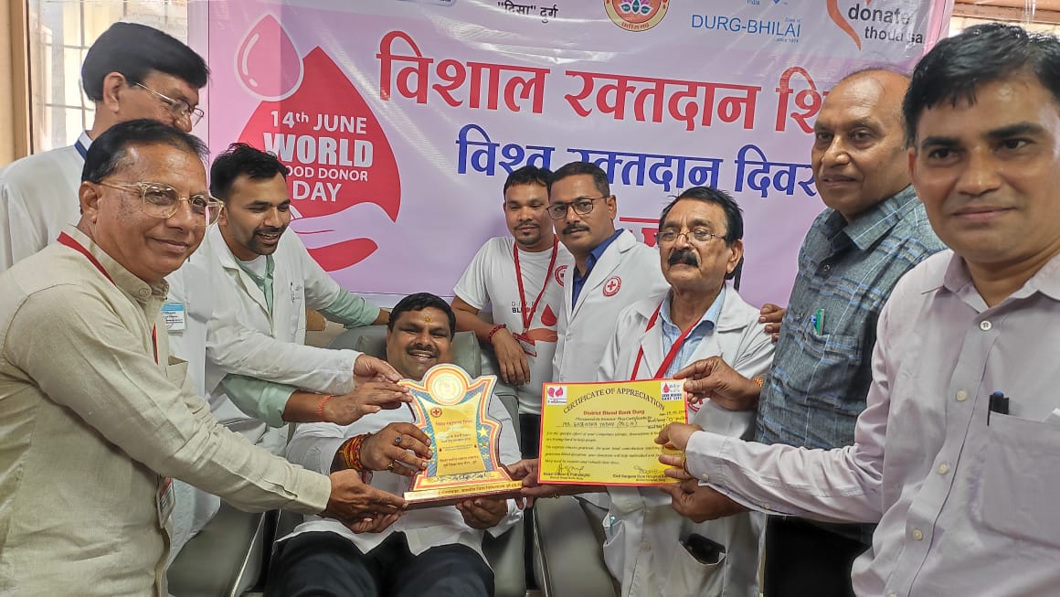 ब्लड बैंक जिला चिकित्सालय दुर्ग में 14 जून 2024 को रक्तदान शिविर आयोजन में विधायक श्री गजेन्द्र यादव द्वारा ब्लड सेंटर जिला चिकित्सालय दुर्ग में अपना ओ पॉजीटीव रक्तदान किया। आयोजित शिविर में नव दृष्टि फाउडेशन, समर्पित परिश्रमी समाजिक समिति दिशा दुर्ग, जे.सी.आई. दुर्ग भिलाई, डोनेट थोड़ा सा, छ.ग. ब्लड डोनर फाउडेंशन, महेश्वरी रक्तदान सेवा, आईसीएआई सी.ए. बॉच व एन.सी. सी. दुर्ग के संस्थाओं द्वारा कुल 171 यूनिट रक्तदान किया गया। कार्यक्रम का संचालन डॉ नेहा नलवॉया, रक्तदान हेतु शपथ श्री तृपेश शर्मा, आभार प्रदर्शन डॉ. प्रवीण कुमार अग्रवाल ने किया।