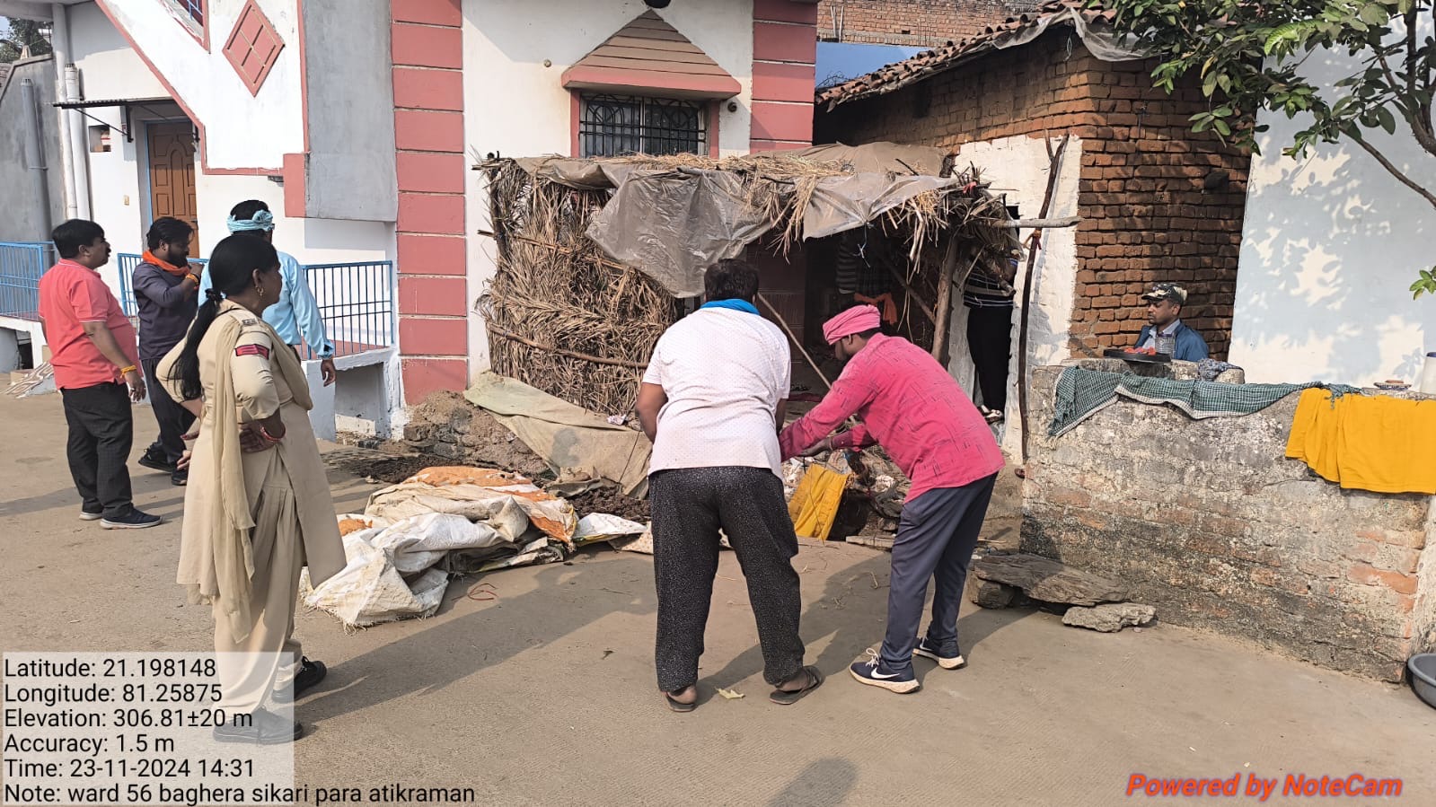दुर्ग/ 23 नवंबर/नगर पालिक निगम क्षेत्रांतर्गत वार्ड नबर 56, बघेरा में गांधु नामक द्वारा नाली क्षेत्र के उपर स्थायी / अस्थायी निर्माण कार्य करते हुए नाली क्षेत्र को बंद कर अतिक्रमण कर कब्जा किया गया था।जिसकी लेकर मोहल्लेवासियों ने कलेक्टर टीएल शिकायत में भी की गई थी।जिसके आधार पर नगर निगम कमिश्नर सुमित अग्रवाल के निर्देश पर 56, बघेरा में कार्रवाही स्थल पहुँचकर टीम ने कब्जा मुक्त कर निराकरण किया गया।शनिवार को 56 बघेरा में संतोष पारधी नामक द्वारा नाली क्षेत्र के उपर स्थायी / अस्थायी निर्माण कार्य करते हुए नाली क्षेत्र को बंद कर अतिक्रमण कर कब्जा किया गया था। जिससे नाली क्षेत्र बाधित हो रही है, उक्त निर्माण कार्य के संबंध में अनावेदक को इस कार्यालय से नियमानुसार नोटिस जारी की गई,परंतु अनावेदक द्वारा निर्माण के संबंध में वैध दस्तोवज इस कार्यालय में प्रस्तुत नहीं की गई है।