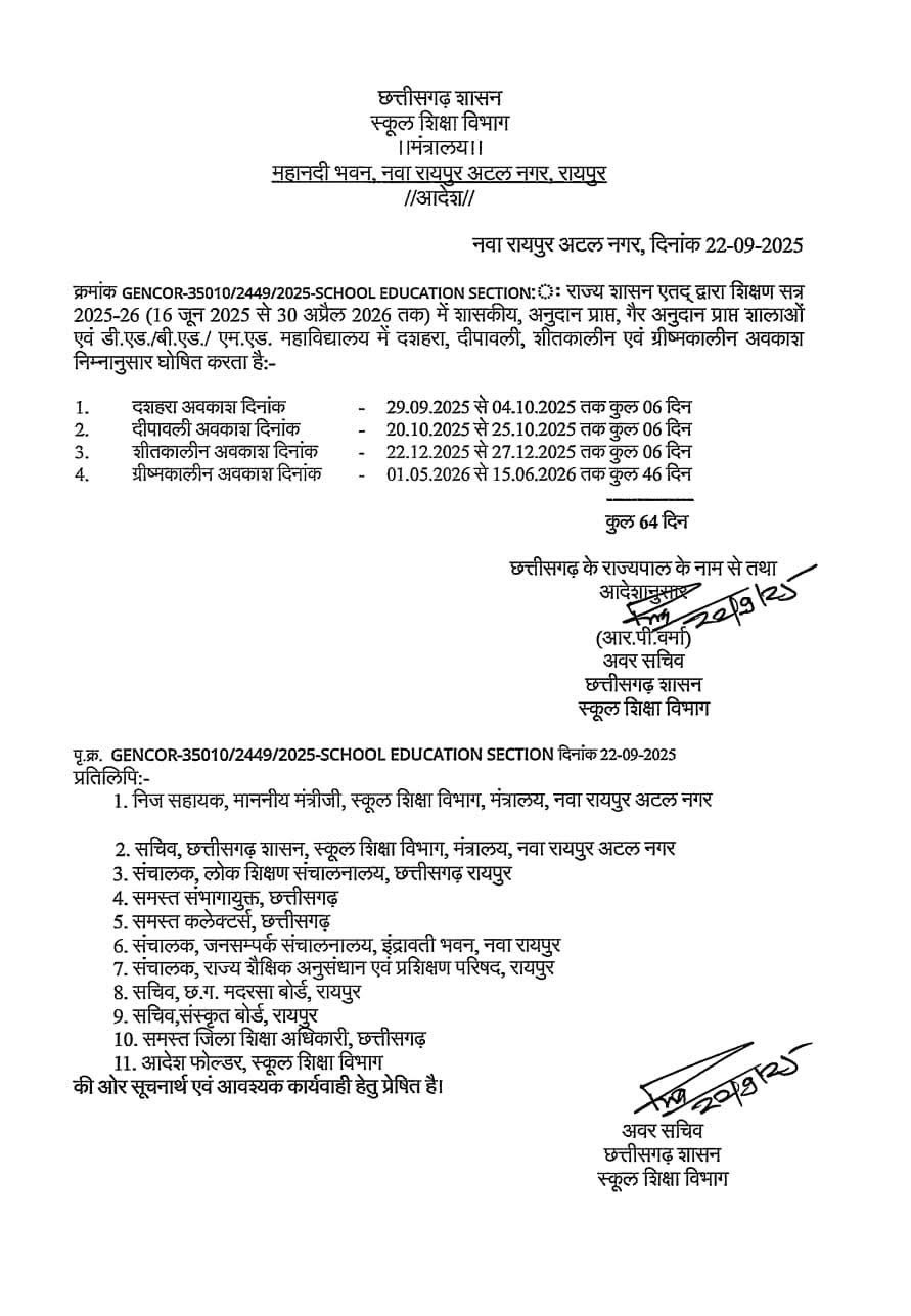 - दशहरा अवकाश : 29 सितम्बर 2025 से 04 अक्टूबर 2025 तक (कुल 06 दिन)