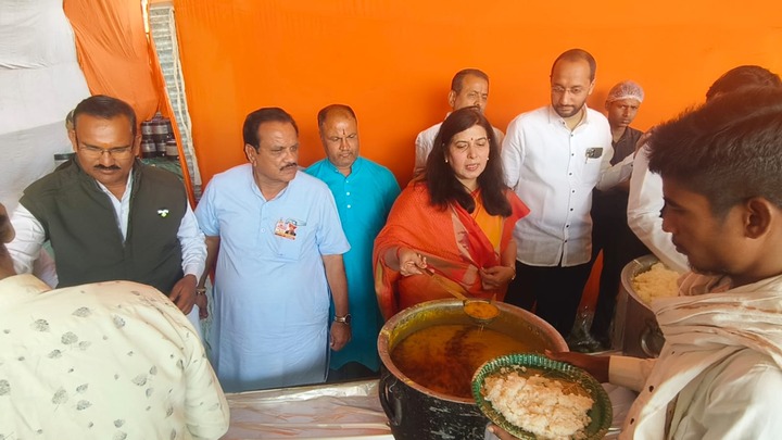 आज भोजन शाला में सरोज पांडेय ने खुद सेवा दी कथा में आए हुए सभी भक्तों को अपने हाथों से भोजन वितरण की..