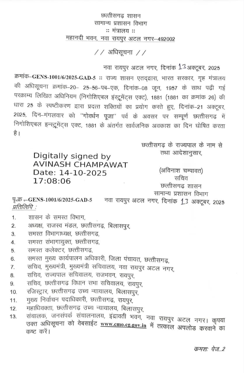 छत्तीसगढ़ शासन ने राज्य में आगामी 21 अक्टूबर 2025 (मंगलवार) को गोवर्धन पूजा पर्व के अवसर पर संपूर्ण छत्तीसगढ़ में सार्वजनिक अवकाश घोषित किया है।
