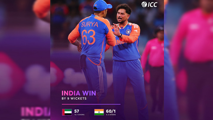 इससे पहले, भारत ने टॉस जीतकर बॉलिंग चुनी और यूएई को बहुत तगड़ा जख्म दिया। भारत ने यूएई को 13.1 ओवर में महज 57 रनों पर ढेर कर दिया। यह यूएई का टी20 इंटरनेशनल क्रिकेट में सबसे छोटा स्कोर है।