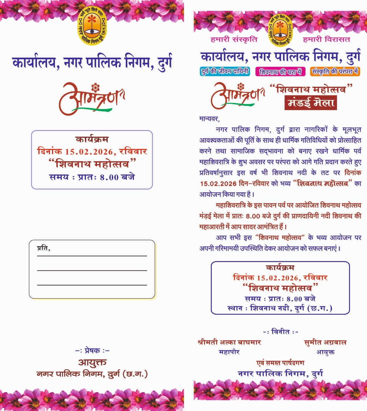 दुर्ग निगम में किसकी चली?….शिवनाथ महोत्सव के आमंत्रण पत्र से प्रभारी पार्षद और सभापति का नाम गायब, निगम में उठे सवाल