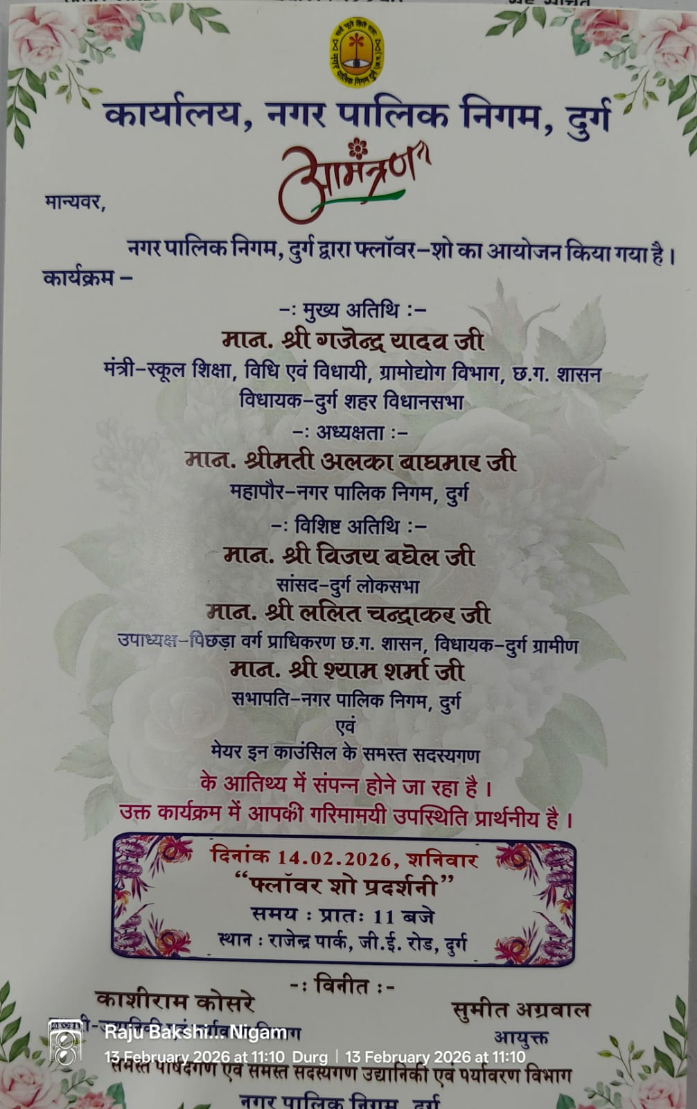 गौरतलब है कि 14 फरवरी को आयोजित फ्लावर शो के आमंत्रण पत्र में दुर्ग की महापौर अलका बाघमार, स्कूल शिक्षा मंत्री, सांसद, निगम आयुक्त सुमित अग्रवाल सहित संबंधित विभागीय प्रभारी का नाम प्रमुखता से अंकित किया गया है। वहीं 15 फरवरी के शिवनाथ महोत्सव के आमंत्रण पत्र से प्रभारी और सभापति दोनों का नाम गायब होना चर्चा का विषय बन गया है।