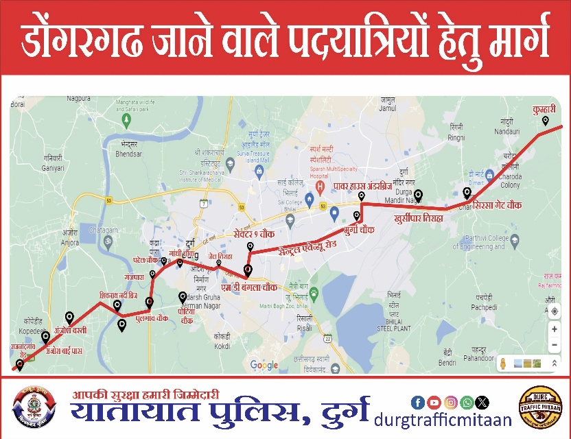 पदयात्रियो के लिए बनाये गये रूट चार्टः- कुम्हारी टोल प्लाजा-सिरसा गेट चौक-डबरापारा तिराहा-खुर्सीपार तिराहा-पावर हाउस अण्डर ब्रिज-मुर्गा चौक-सेन्ट्रल एवेन्यु होते हुए सेक्टर-09 चौक- MD बांग्ला तिराहा – ठगडा बांध ओवर ब्रिज के नीचे-जेल तिराहा-गांधी तिराहा-पटेल चौक-गंजपारा-पुलगांव चौक-शिवनाथ नदी ब्रिज-अंजोरा बाईपास-राजनांदगांव से होकर डोगरगढ़ जायेगें।