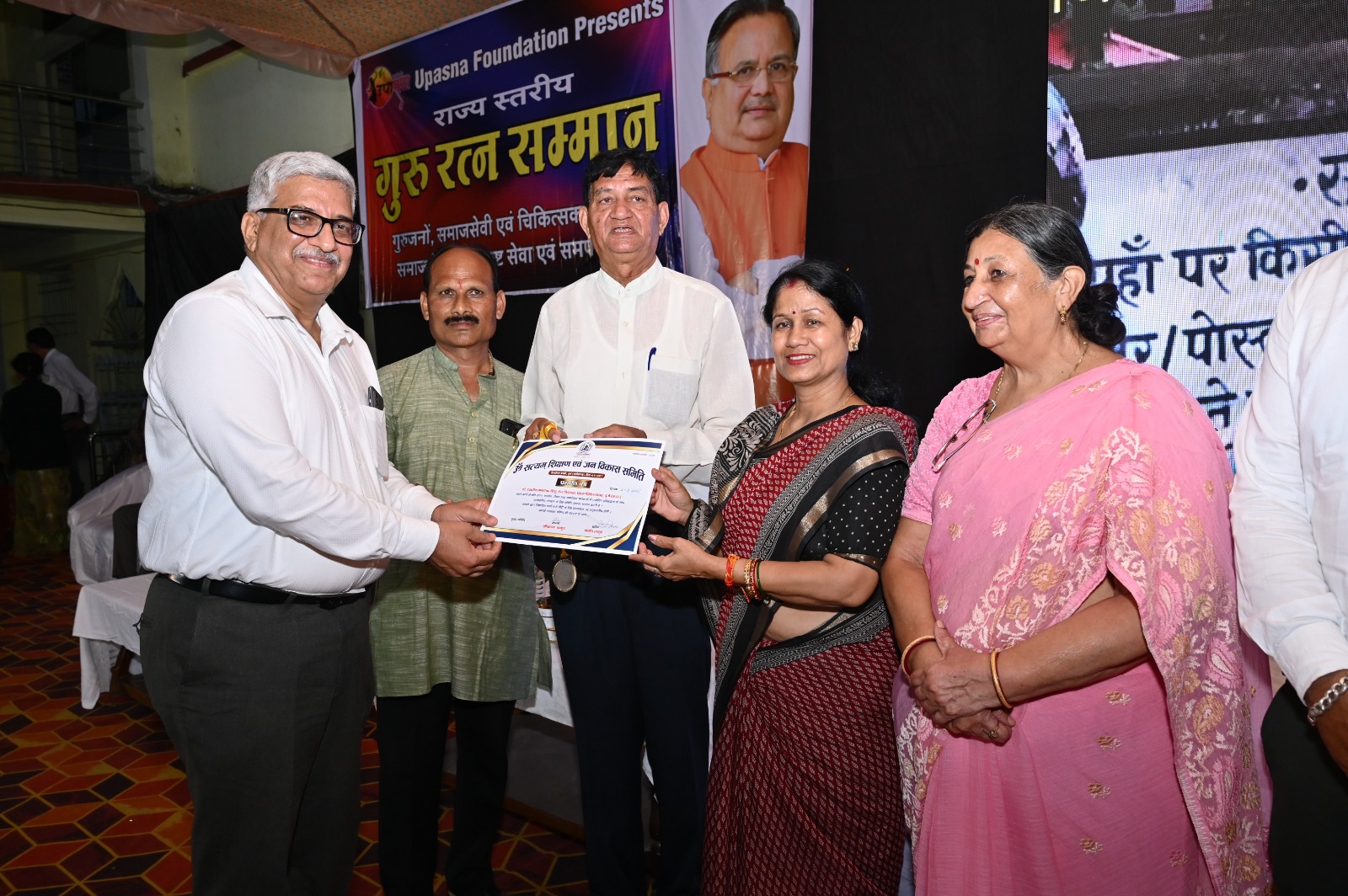 दुर्ग। उपासना फाउंडेशन एवं ओम सत्यम शिक्षण एवं जन विकास समिति के संयुक्त तत्वावधान में आयोजित एक भव्य सम्मान समारोह में शहर के प्रतिष्ठित समाजसेवियों एवं शिक्षकों को सम्मानित किया गया। इस अवसर पर उपासना फाउंडेशन के संचालक एवं ओम सत्यम शिक्षण एवं जन विकास समिति के अध्यक्ष सीताराम ठाकुर तथा सचिव दिलीप ठाकुर की गरिमामयी उपस्थिति रही।