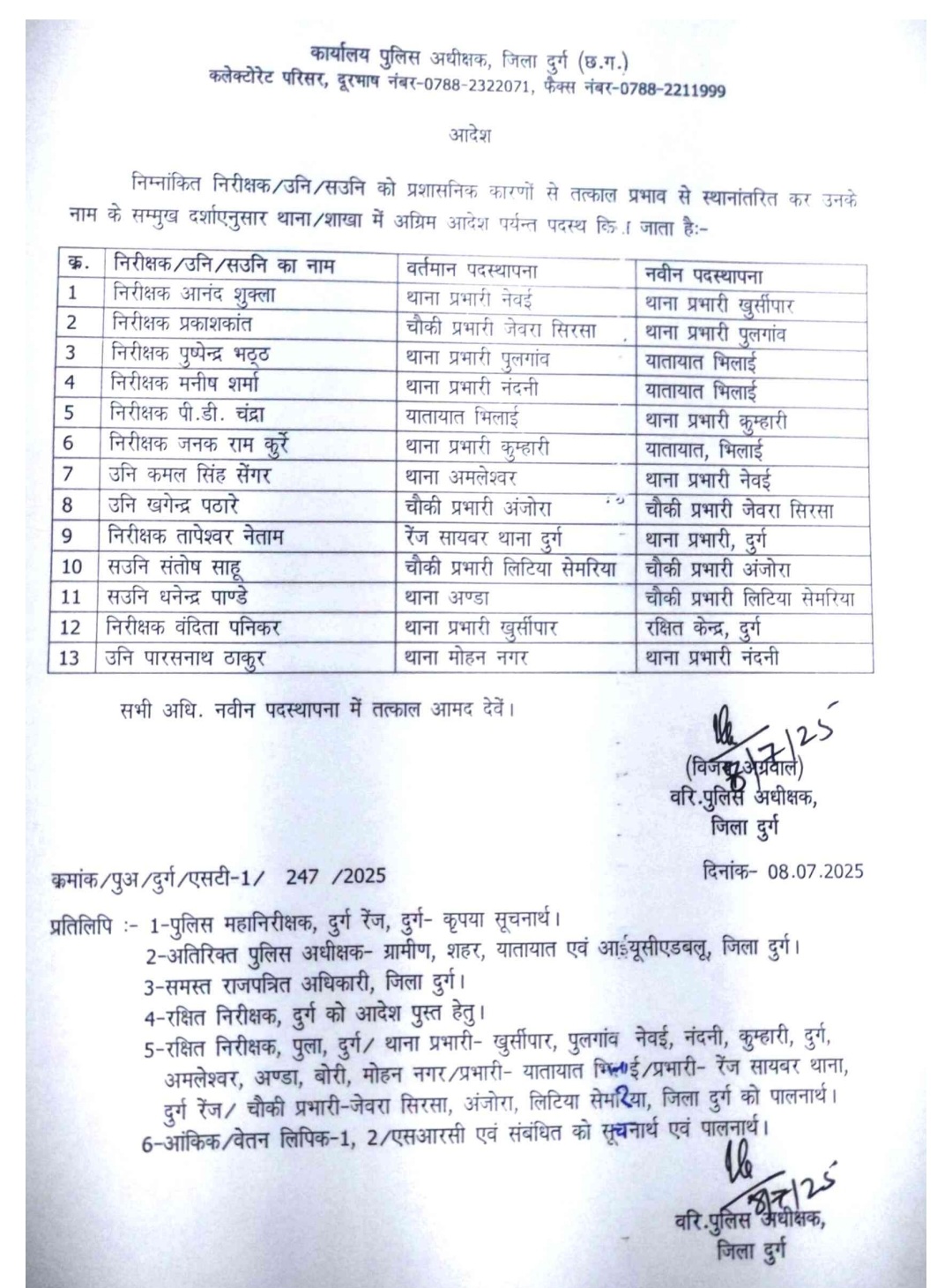 दुर्ग ब्रेकिंग: SP विजय अग्रवाल ने 13 पुलिस अधिकारियों का किया तबादला……देखें लिस्ट