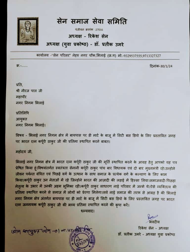 वैशाली नगर विधायक एवं सेन समाज सेवा समिती के अध्यक्ष रिकेश सेन की पहल पर जननायक कर्पूरी ठाकुर की प्रतिमा भिलाई नगर निगम क्षेत्र में स्थापित किया जाएगा।पूरे प्रदेश में ये उनकी पहली प्रतिमा होगी।इस विषय को लेकर विधायक रिकेश सेन ने भिलाई नगर निगम के महापौर एवं आयुक्त को पत्र प्रेषित कर उल्लेख किया है कि स्वतंत्रता सेनानी कर्पूरी ठाकुर पांच बार विधायक एवं दो बार मुख्यमंत्री रहे हैं।उन्होने जीवन पर्यन्त वंचित एवं पिछड़े वर्ग के उत्थान के साथ समाज के प्रत्येक वर्ग के कल्याण के लिए काम किया।कर्पूरी ठाकुर उन नेताओं में रहे जिन्होंने भारत की आज़ादी की लड़ाई में हिस्सा लिया।समाजवादी-पिछड़ा नेतृत्व के उभार में उनकी अहम भूमिका रही।कर्पूरी ठाकुर साधारण नाई परिवार में जन्मे थे।ऐसे व्यक्तित्व की प्रतिमा स्थापित करने से समाज में लोगों को प्रेरणा मिलेगा तथा सर्व नाई समाज की तरफ से आग्रह किया है कि भिलाई नगर निगम क्षेत्र अंतर्गत बायपास पर डी मार्ट के बाजू में सिटी बस डिपो के लिए प्रस्तावित जगह पर भारत रत्न जननायक कर्पूरी ठाकुर जी की भव्य प्रतिमा स्थापित किया जाए।